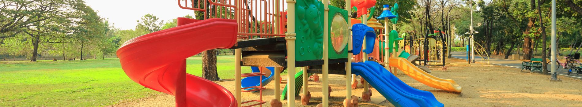 A well-maintained park featuring a variety of play equipment suitable for different age groups, making it a great spot for families to enjoy a day outdoors.